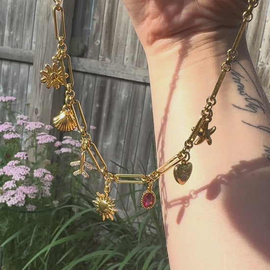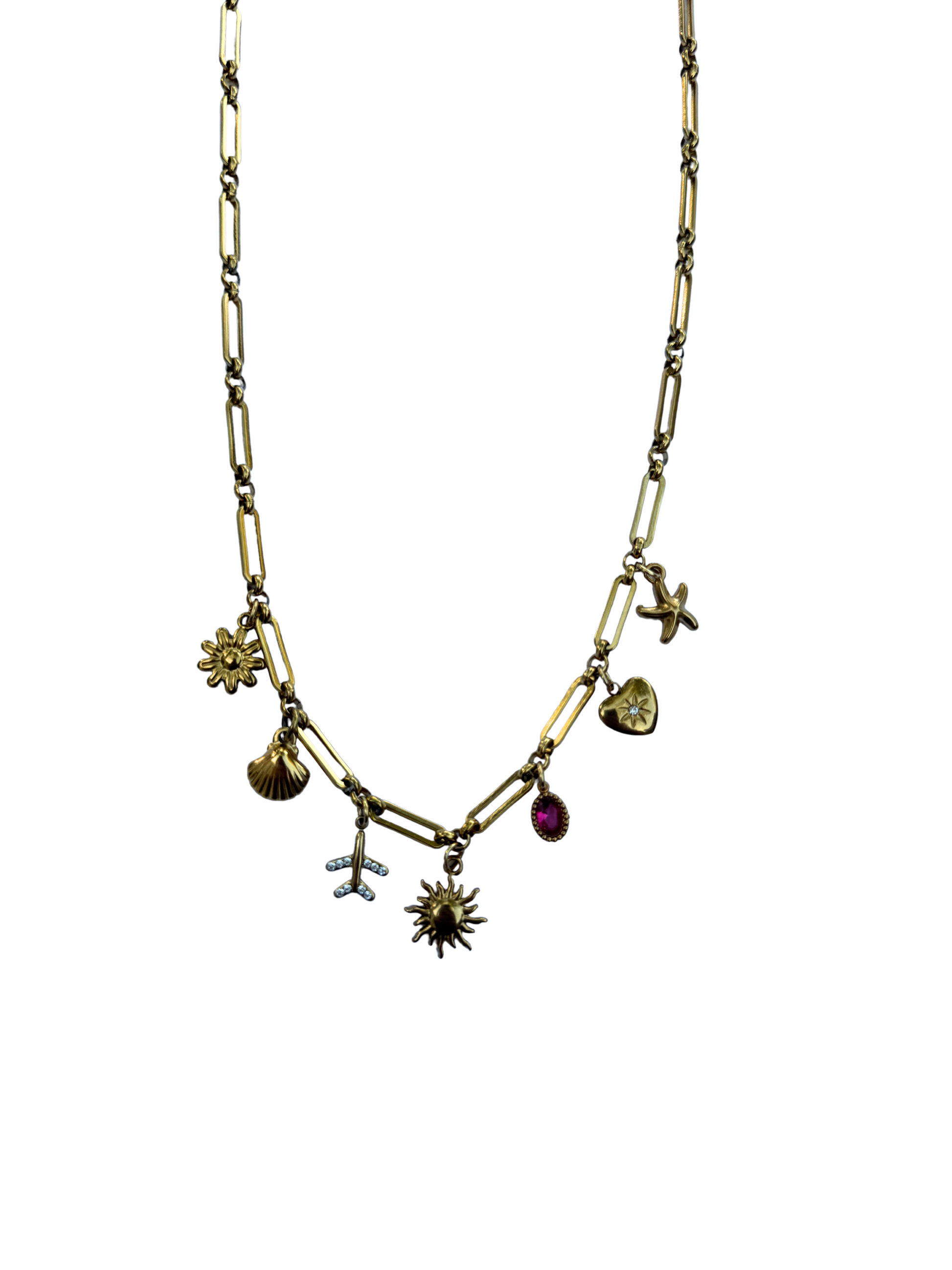 Stainless Steel PVD Plated 18K Gold. Medium paperclip chain with charms that encapsulate all of your summer plans. Assembled and designed with love by Coastal Charm. Tarnish free and waterproof.
