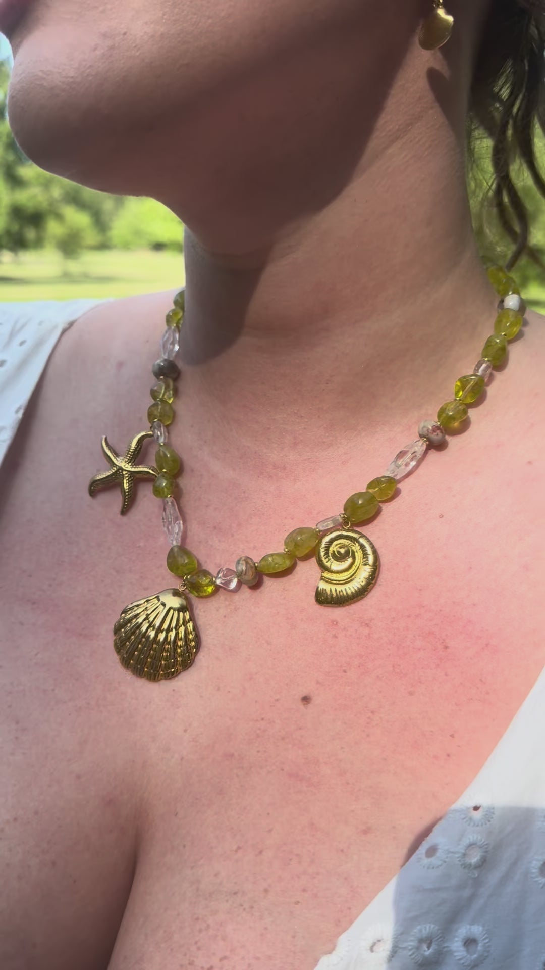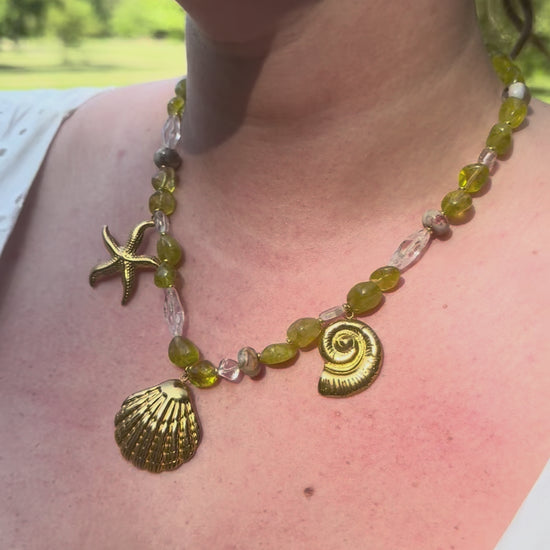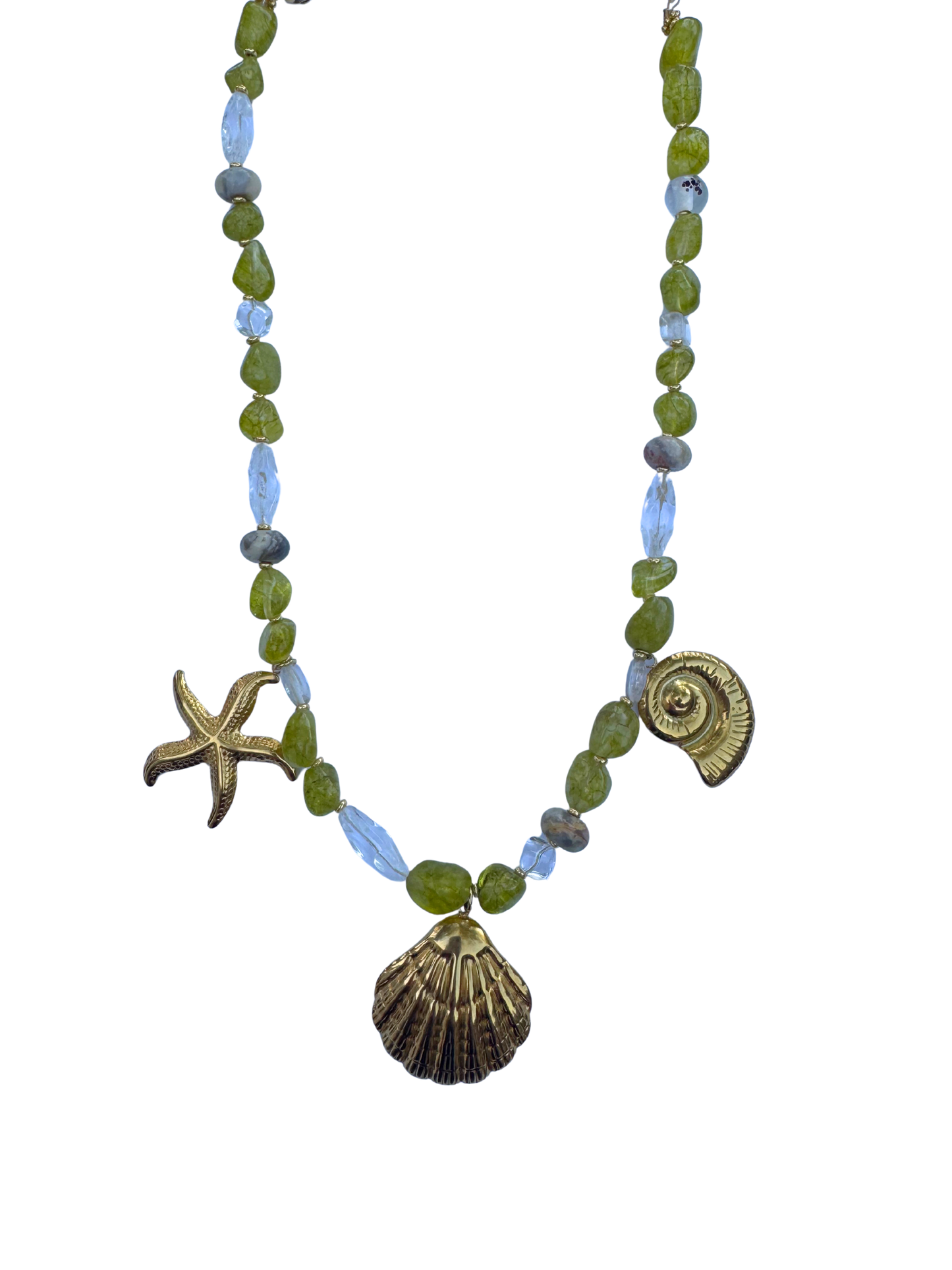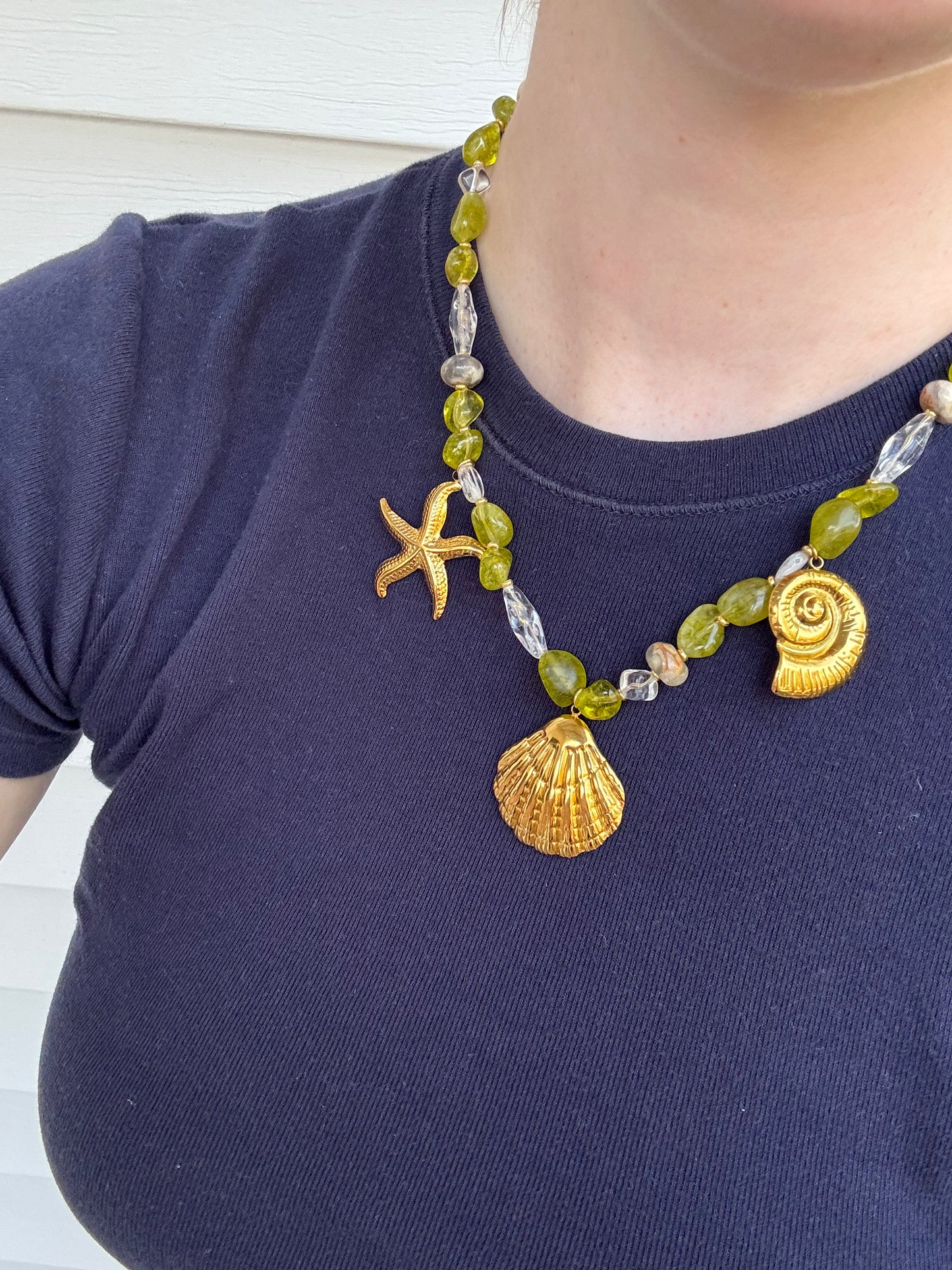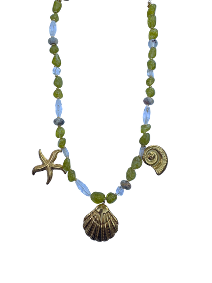 Hand beaded necklace made with real natural stones sourced in New Hampshire. Stainless steel PVD 18k gold nautical charms. This necklace speaks for itself. One of a kind. Assembled and designed with love by Coastal Charm. Tarnish free and waterproof.