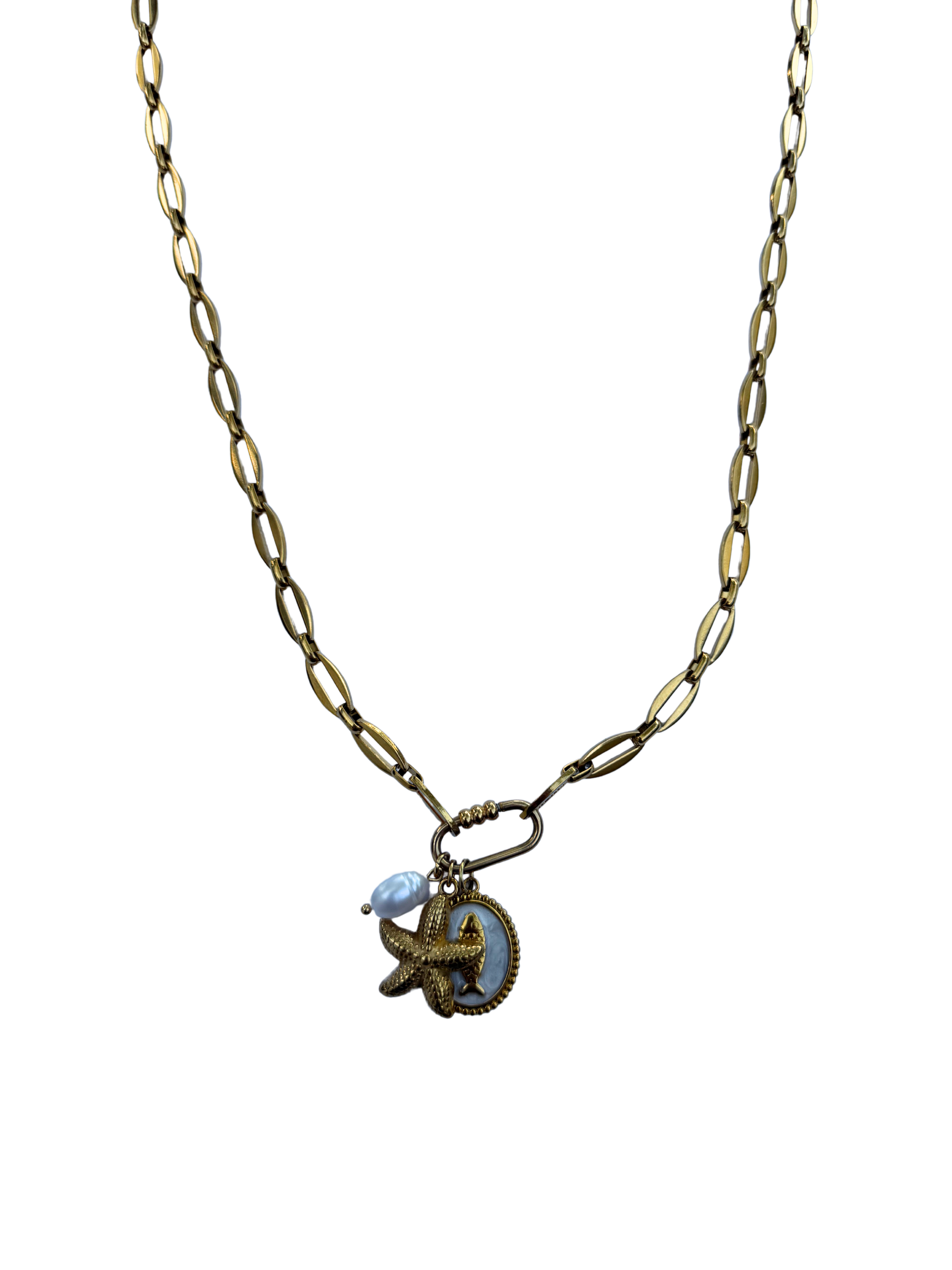 Staple coastal charm necklace. Stainless Steel PVD Plated 18K Gold. Unique link chain with central clasp to add and remove charms as well as standard clasp on back. Assembled and designed with love by Coastal Charm. Tarnish free and waterproof.