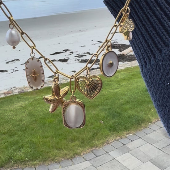Stainless Steel PVD Plated 18K Gold. Paperclip chain with chunky white and gold charms. Assembled and designed with love by Coastal Charm. Tarnish free and waterproof.